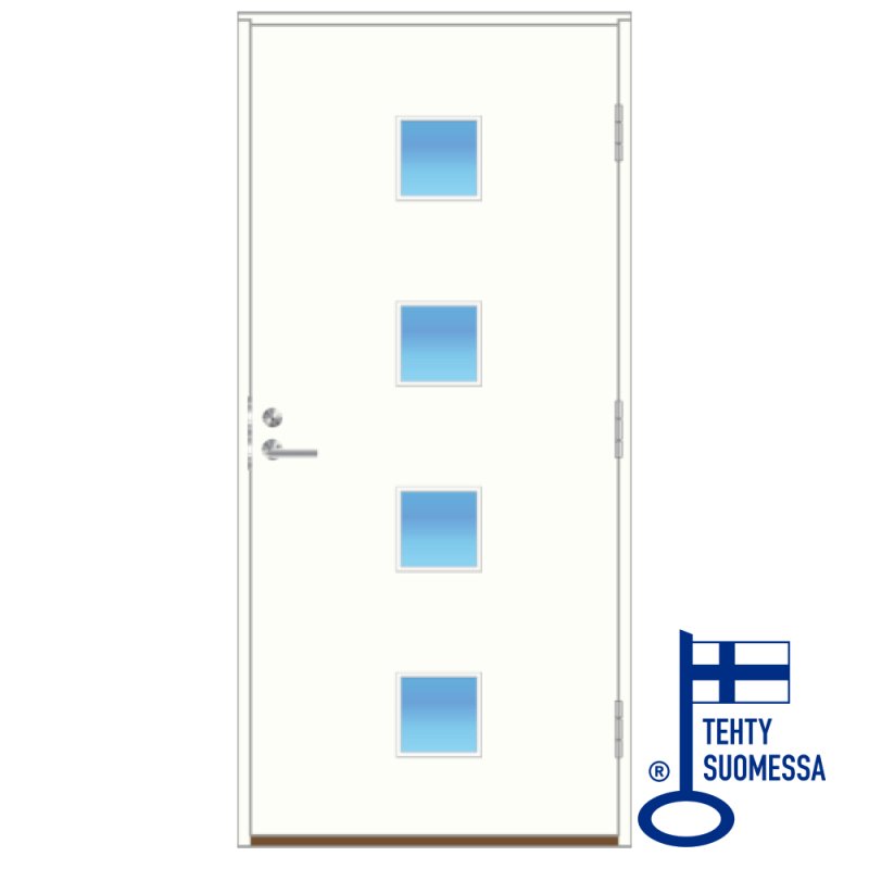 Yksilehtinen sileäpintainen lämpöeristetty ja alumiinijäykistetty ulko-ovi neliö laseilla. Kokonaisvahvuus 78mm ovilevy, U-arvo 0,6-0,9 (mallista riippuen). Kaksinkertainen tiivistys, 4mm HDF-pintalevyt. 3K tuplaselektiivi + argon lämpölasitus kirkkaalla lasilla. 41 mm korkea kovapuukynnys alumiinisella kulutuslistalla. Säädettävä vastarauta. Abloy N3248-110PMKSS2 säädettävät murtosuojasaranat (säätö ylös, alas, sivulle). 12 vuoden suoranapysymistakuu ja 3 vuoden rakennetakuu. Sisältää Abloy LC102 lukkorungon vakiona.