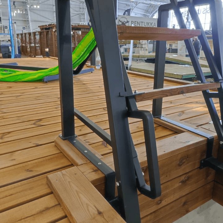 Saat nostettua Savorakin uimaportaan helposti pois vedestä kääntövivun ansiosta. Kääntyvät uimaportaat ovat pitkäikäiset ja turvalliset, koska ne eivät pääse limoittumaan vedessä. Lisäksi niiden huoltaminen on huomattavan paljon helpompaa kuin kiinteiden portaiden. Savorakin uimaporras jää tarkoituksella käännettynä pystyasentoon, eikä näin ollen vie laiturilta oleskelutilaa, eikä aiheuta kompastumisvaaraa. Puuosien käyttöikää voit pidentää öljyämällä niitä säännöllisesti.