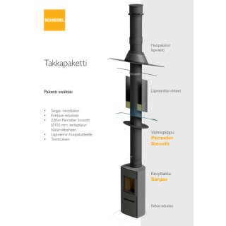 Kevyttakkapaketti sisältää Sargas1 tulisijan, kirkkaan kipinälasin tulisijan eteen, sekä 2,85m teräspiippupaketin, jossa vesikaton läpivientipaketti huopakatteelle.